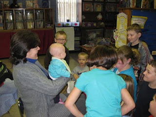 Daniel and I didn't have to work Monday so we were able to stay in Lincolnton Sunday night. Monday we took Adelyn to see Kim at her school. She teaches reading at an Elementary school there in Lincolnton. It was so fun to be able to go and see where she works everyday. You really wouldn't believe the amount of books she has in there!!!! Ever since Adelyn was born, Kim has had a mini blog on the classroom wall all about Adelyn. :) Each week she post a new picture and paragraph about Adelyn and the children get to read it aloud. She has told us that every week they get so excited to read the new update on Addie. So sweet. Since we were coming to town we all thought it was a good opportunity for us to take Addie for them to actually get to meet her in person. She told them Monday morning that there was a surprise! :)